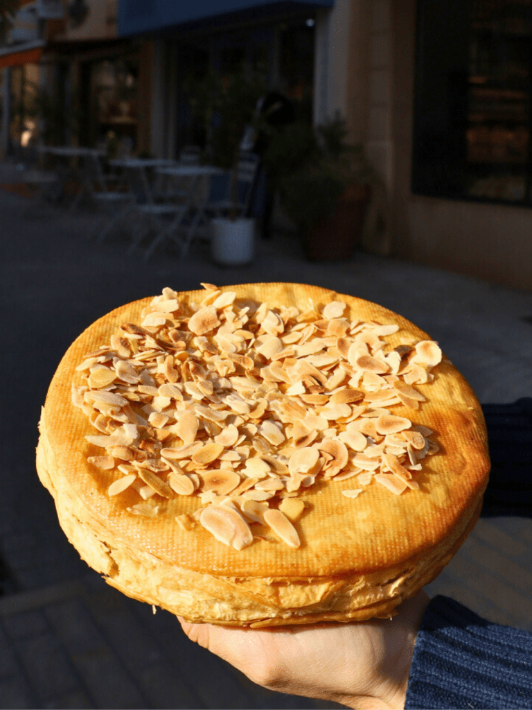 La franginess : . Feuilletage inversé avec un beurre AOP Poitou-Charantes, Crème frangipane amande / Noisette, Amandes effilés sur le dessus pour encore plus de craquant.