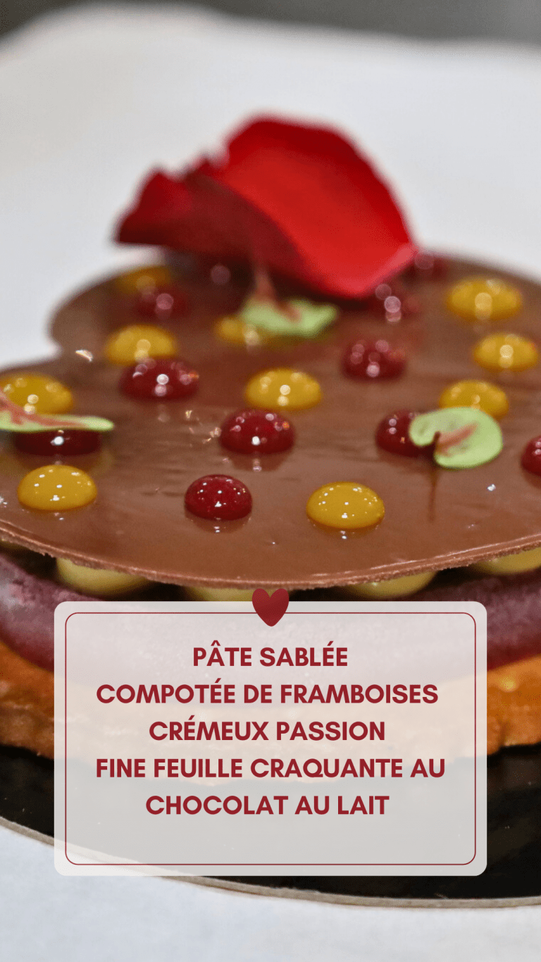 Sur une base de pâte sablée croustillante, une compotée de framboises généreuse rencontre un crémeux passion onctueux, le tout sublimé par une fine feuille de chocolat au lait.